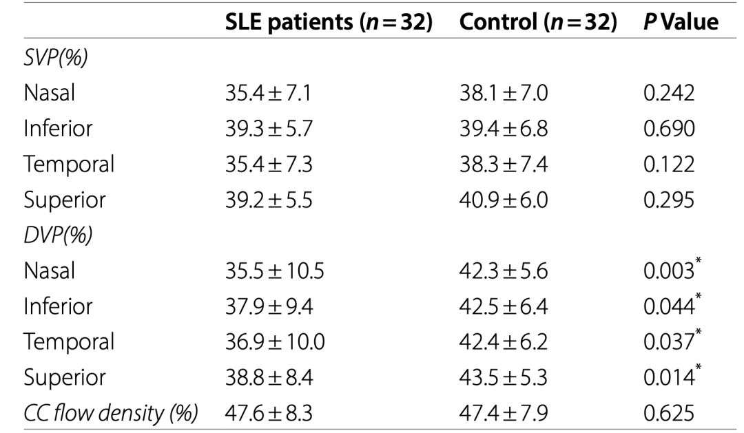 SVP,浅层血管丛;DVP,深层血管丛;CC,脉络膜毛细血管层。*P < 0.05(表示差异具有统计学显著性)
