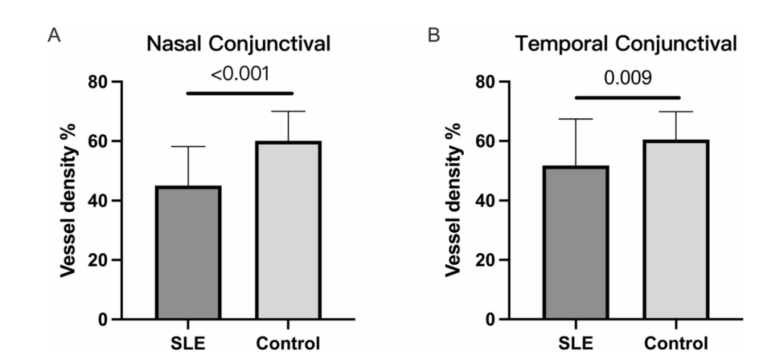 图2 对照组与系统性红斑狼疮(SLE)组结膜微血管密度对比。A:SLE患者与对照组鼻侧结膜血管密度比较,P < 0.001。B:SLE患者与对照组颞侧结膜血管密度比较,P = 0.009。