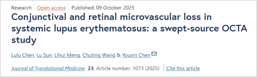 中国医学科学院北京协和医院眼科的陈有信教授带领团队,在国际知名学术期刊《Journal of Translational Medicine》上发表了篇文章,题为《Conjunctival and retinal microvascular loss in systemic lupus erythematosus: a swept-source OCTA study》(系统性红斑狼疮结膜与视网膜微血管减少:一项扫频源OCTA研究)。本研究首次通过扫频源光学相干断层扫描血流成像(SS-OCTA),系统分析SLE患者结膜与视网膜微血管的改变,并评估其作为生物标志物的潜力。