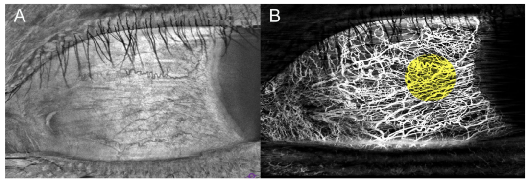 图1 结膜AS-OCTA图像。A:患者鼻侧结膜图像。B:鼻侧结膜的OCTA扫描图,黄色区域为感兴趣区域(ROI)。