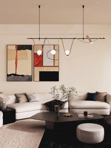 客厅采用环绕式布局,选用进口的弧形模块沙发,搭配黑色曲面岩板茶几,营造出温馨的家庭交流氛围。