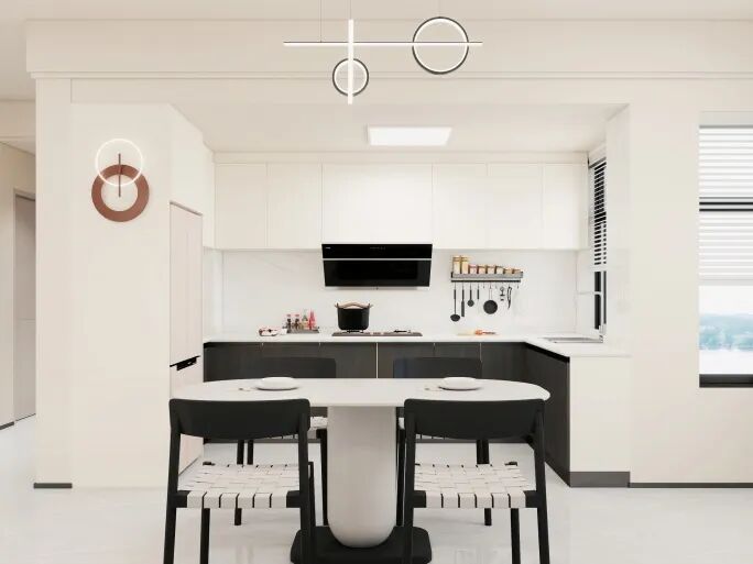 厨房采用高效的U型布局,超长操作台面依照"取-洗-切-炒"黄金动线设计,转角处设置多功能水槽区,让烹饪过程流畅自如。