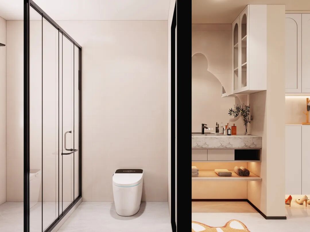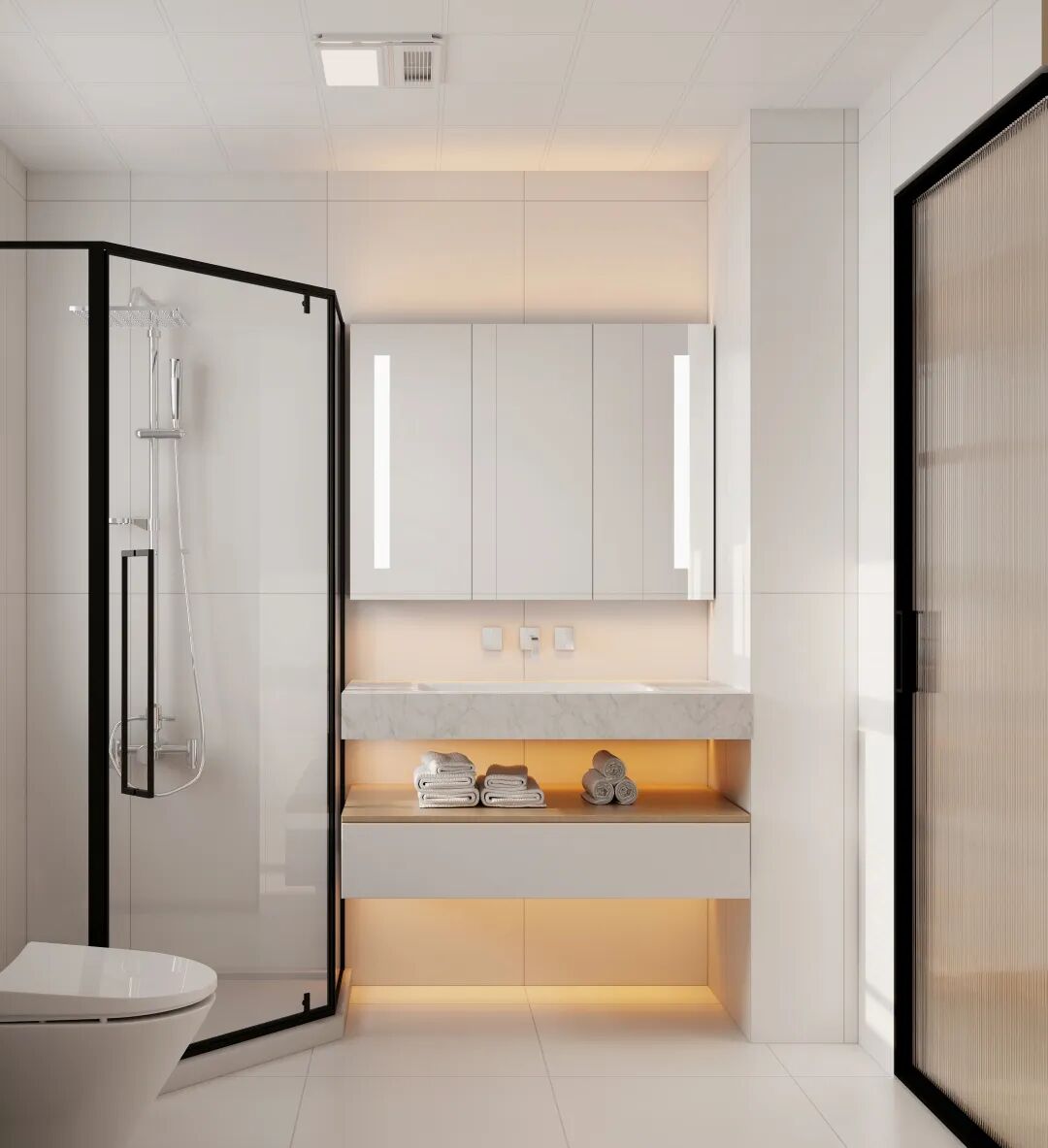 入户门旁的公共卫生间采用经典的干湿三分离设计。洗漱区定制墙面收纳柜,既方便进门后第一时间洗手,又提升了空间质感。