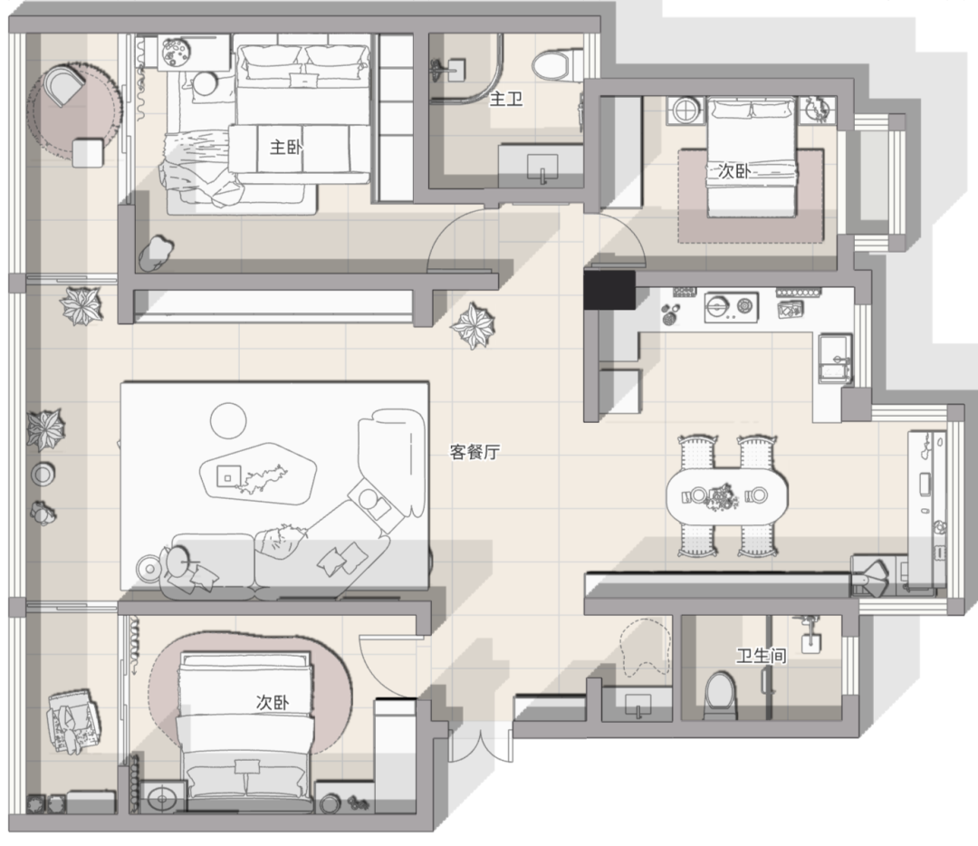 阳台打通后引入充沛自然光,与地面形成柔和的光影互动。