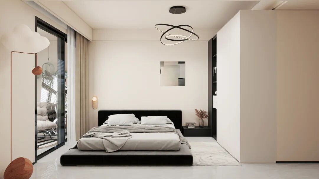 主卧选用宽大的落地软包床头,衣柜采用80%白色+20%黑色的色彩比例,结合开放格与封闭柜门,既满足多样储物需求,又保持视觉清爽。