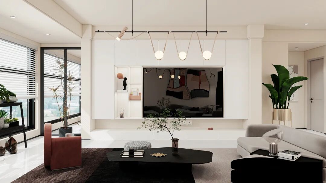 电视背景墙采用整墙定制储物系统,将电视、影音设备和日常杂物完美隐藏。