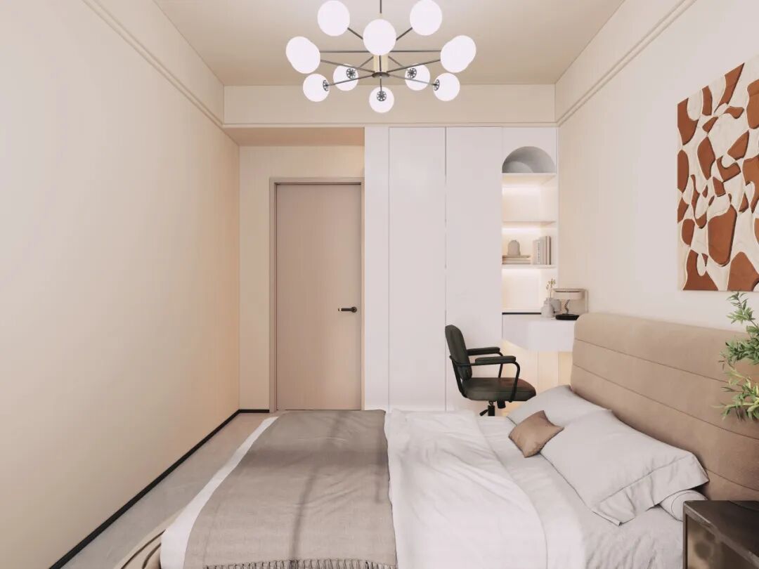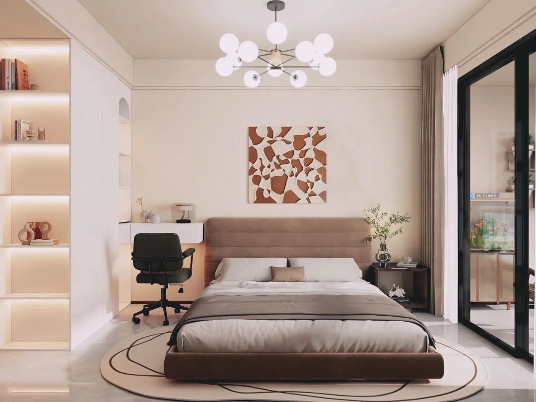 次卧采用温润的白+咖配色,通顶衣柜自然延伸出悬浮式书桌,兼具办公与梳妆功能。