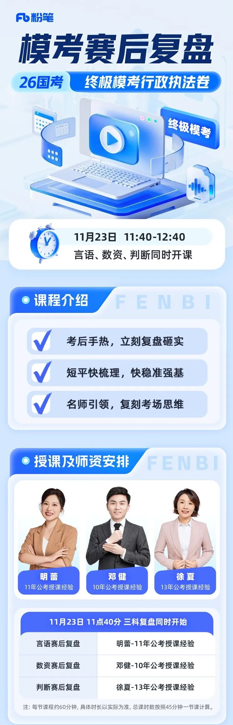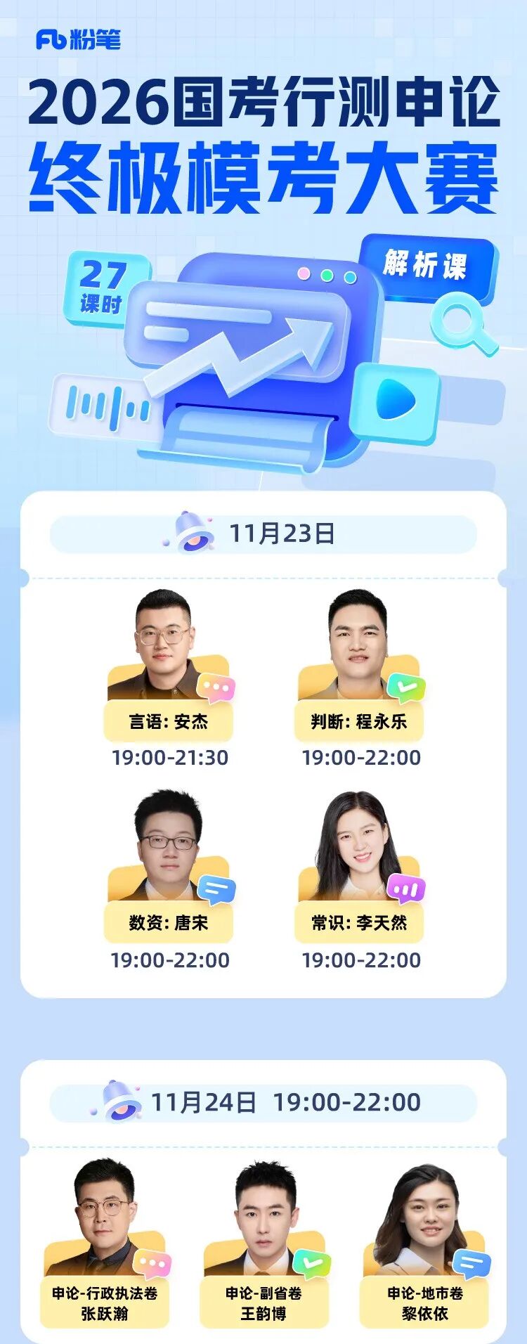 在模考大赛终极解析课中,粉笔名师将结合大数据进行直播解读,此次直播课将明确考试中的重点难点,为同学们拨开备考迷雾,直击得分要点。