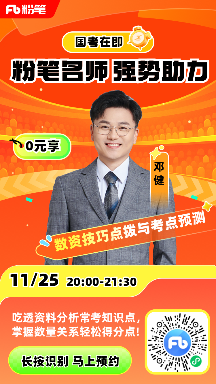 数资:邓健老师带你深入吃透资料分析常考知识点,精准掌握数量关系轻松得分点。助力你在国考中快人一步,轻松斩获高分。