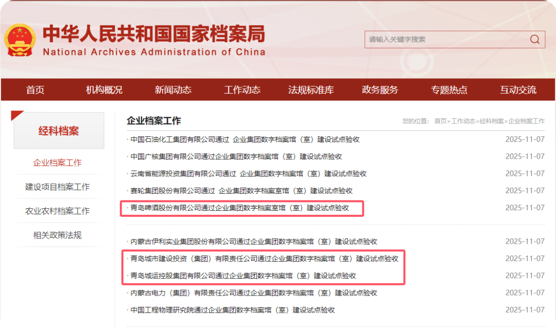 近日,由青岛方天科技股份有限公司(以下简称“方天股份”)参与承建的青岛啤酒股份有限公司、青岛城市建设投资(集团)有限责任公司和青岛城运控股集团有限公司三家企业集团的“国家档案局企业集团数字档案馆(室)建设试点项目”(以下简称“试点项目”)历经严格评审,均顺利通过国家档案局和青岛档案局组织的验收。此次三项试点项目的成功验收,不仅标志着方天股份在企业集团数字档案馆(室)建设领域的技术实力与实施能力获得国家级权威认可,也为企业档案数字化转型树立了新标杆。