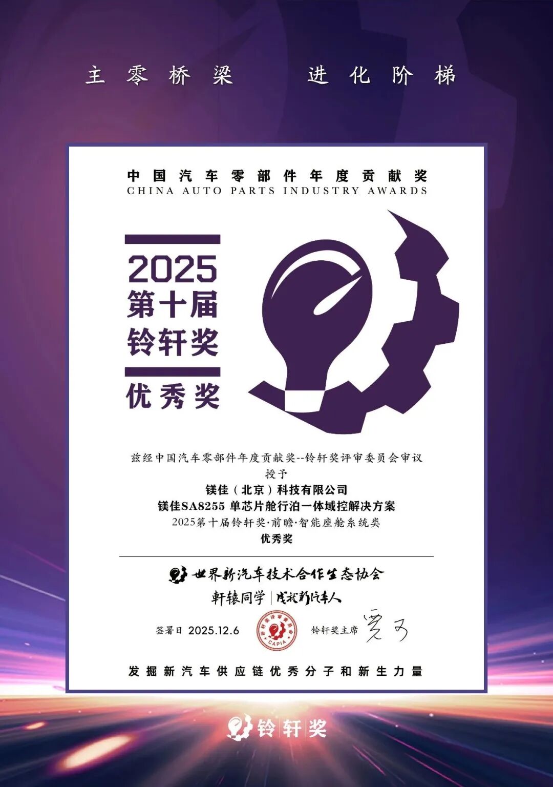 近日,2025新汽车技术合作生态交流会暨第十届铃轩奖盛典在苏州举行。镁佳科技斩获两项殊荣:镁佳自动化智能座舱测试系统获“前瞻·智能装备与工艺类金奖”,镁佳SA8255 单芯片舱行泊一体域控解决方案获“前瞻·智能座舱类优秀奖”。