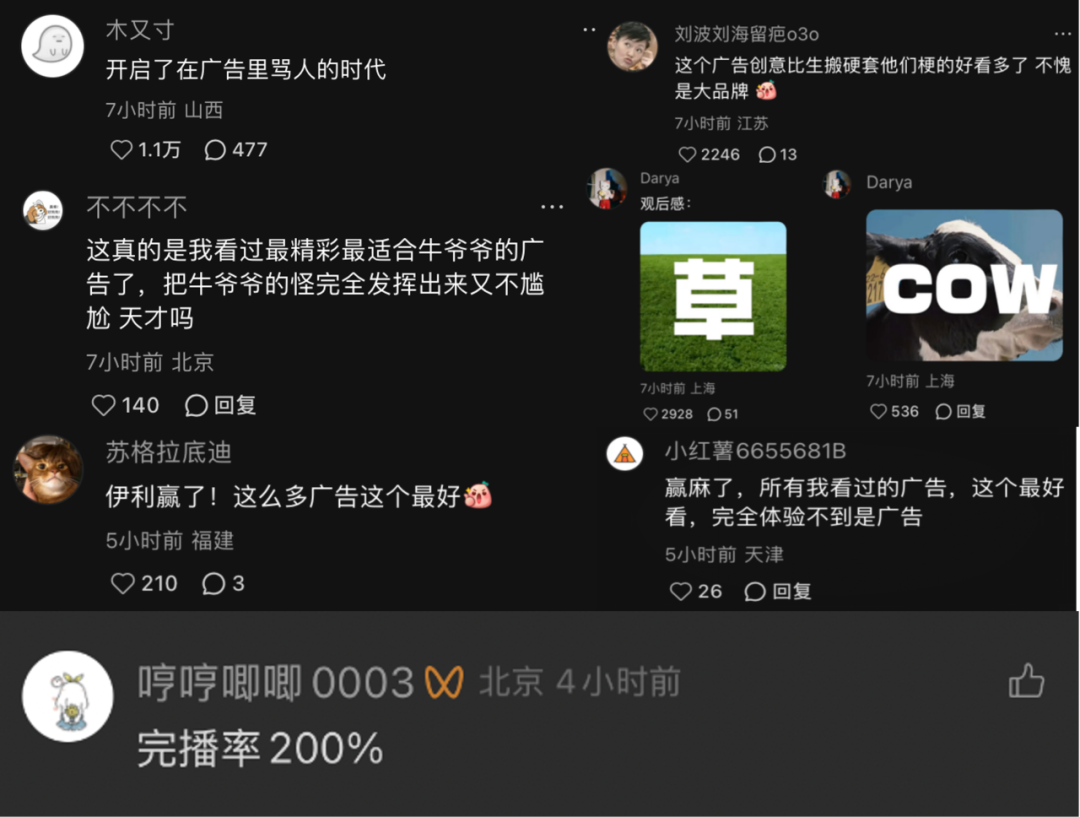 正片上线后,有网友评论:这是最适合牛爷爷的广告/伊利赢麻了/200%完播率……大家的玩梗也让片子的好笑程度连番升级。也许,正是「老人」整出了新活,才有大家口中「200%完播率」的自然达成吧~
