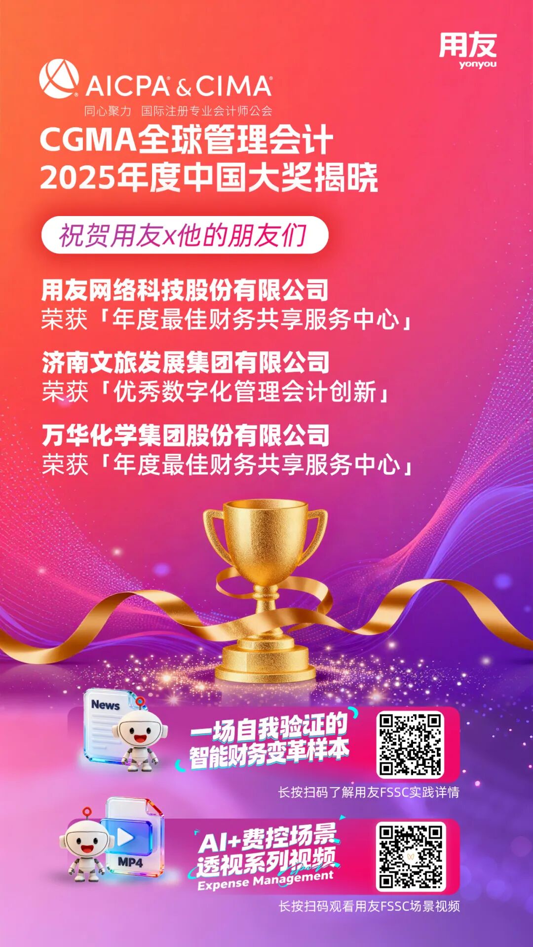 - 祝贺用友和他的伙伴们荣获CGMA全球管理会计2025年度大奖 2小时前