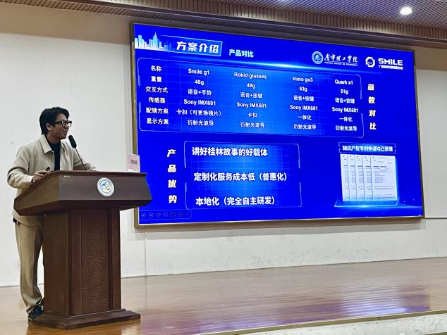 培训会上,我校参会代表,土木与工程学院教师刘小帆博士以“AR智能眼镜重构文旅研学新体验”为主题,向与会的成员单位系统介绍了我校在该领域的前沿探索。这项由我校博士教师团队主导研发的成果,已实现从核心技术到产品应用的全链路突破,并通过孵化企业广西微笑科技有限责任公司实现在旅游场景的成功落地。目前该系列成果已形成能够覆盖当前与未来市场需求的AI+AR智能眼镜产品矩阵,包括适配户外实践与研学互动的Smile g1,以及后续即将推出的支持8K视频播放与体感交互的升级版产品Smile S+和专为研学教育设计的全彩光波导产品Smile C1,为破解文旅体验同质化、研学深度不足等现实问题,提供了有效路径与系统解决方案。