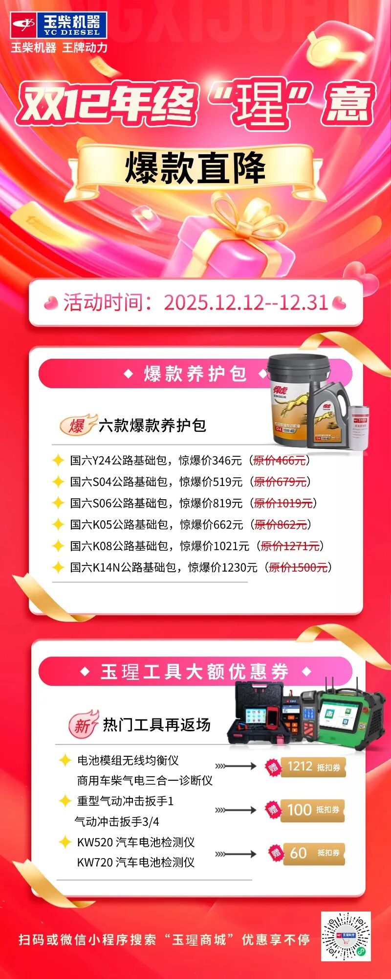这个双十二,玉瑆商城不玩套路,只放真价!国六养护包、专业诊断工具、气动扳手、电池检测仪……全线爆款,直降到底,陪你暖心跨年!
