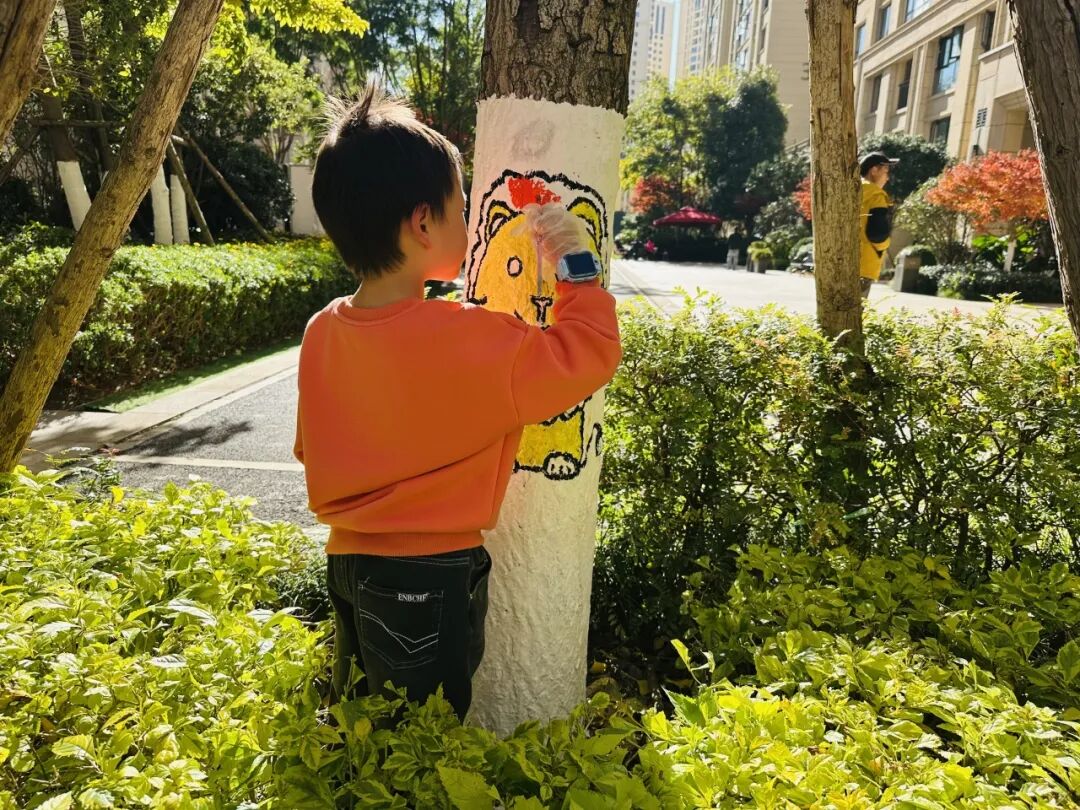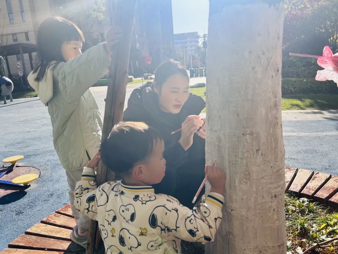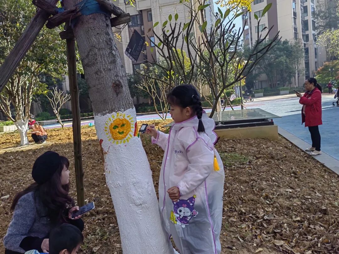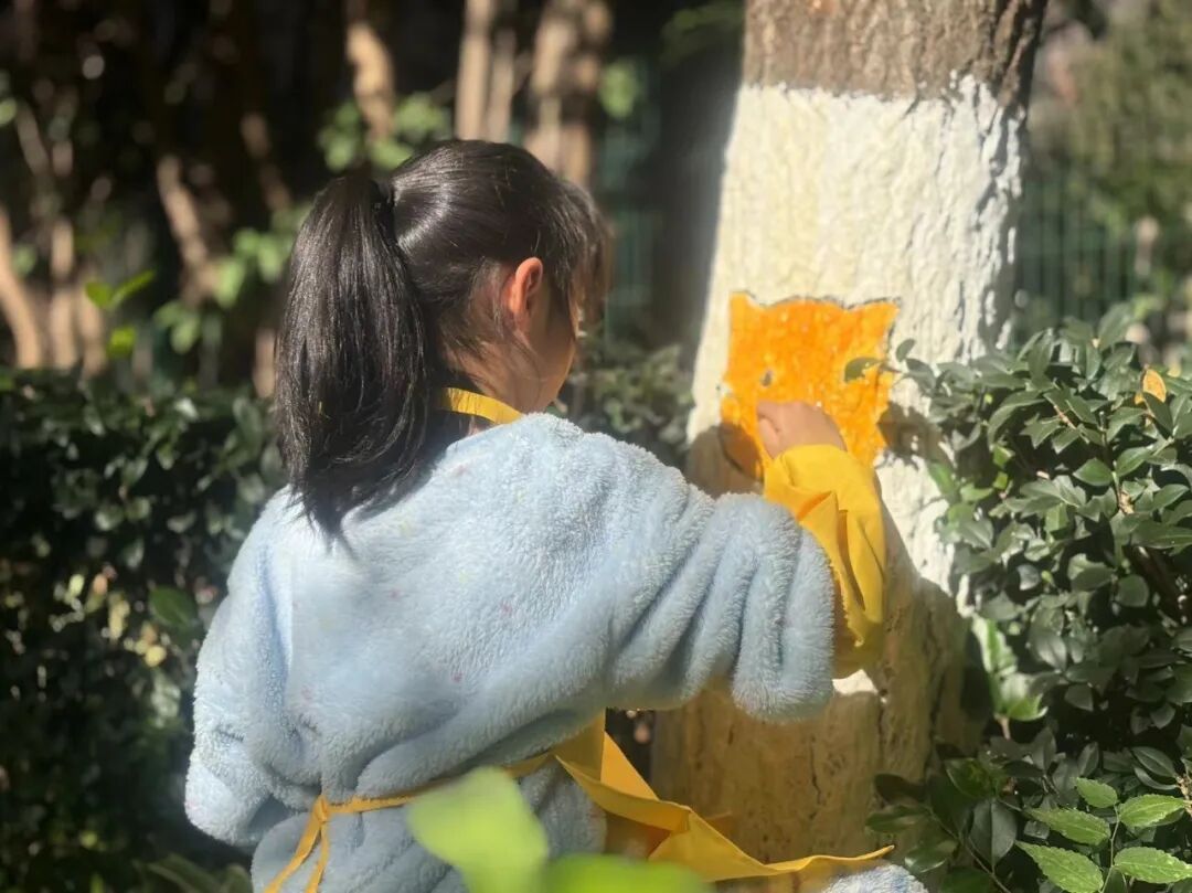 这个秋天,我们和落叶玩了起来。地上拼出图案,树上挂起落叶伞,还邀请小朋友在树干上画画。沉默的树突然讲起了童话,园区好像住进了一个柔软的秋天。