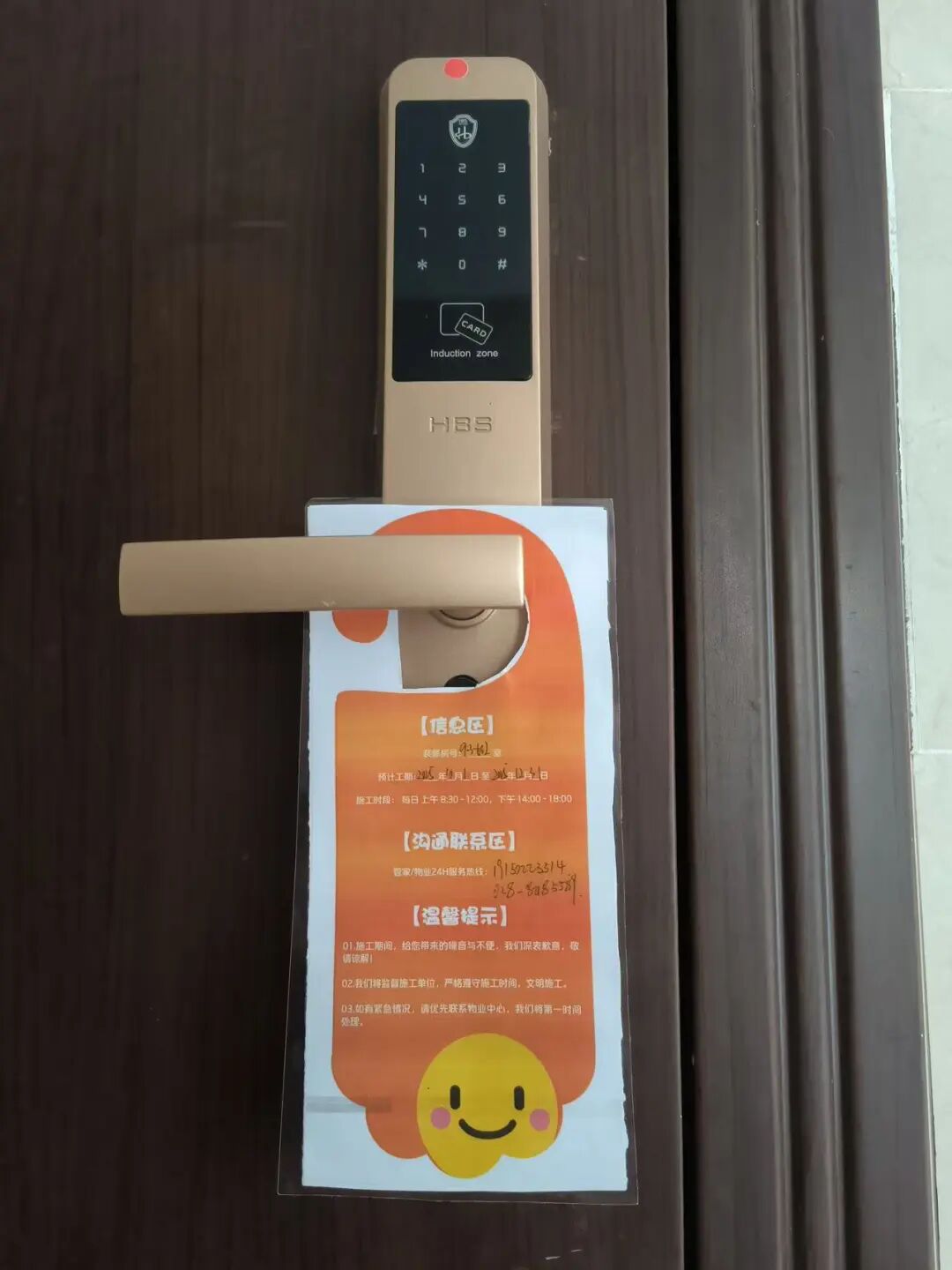 装修的邻居,我们在门上贴了提示卡,写清楚工期和联系方式,不想让噪音成为烦恼。