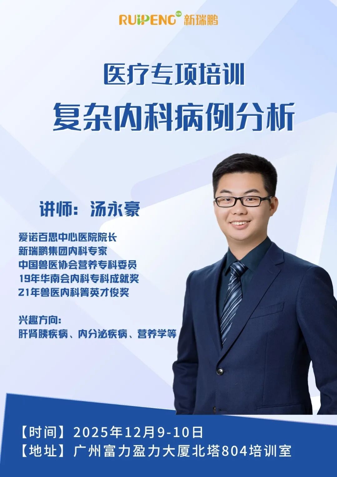 名师领航:本次课程我们有幸邀请到了新瑞鹏宠物医疗集团内科专家、爱诺百思骏景中心医院院长汤永豪老师。