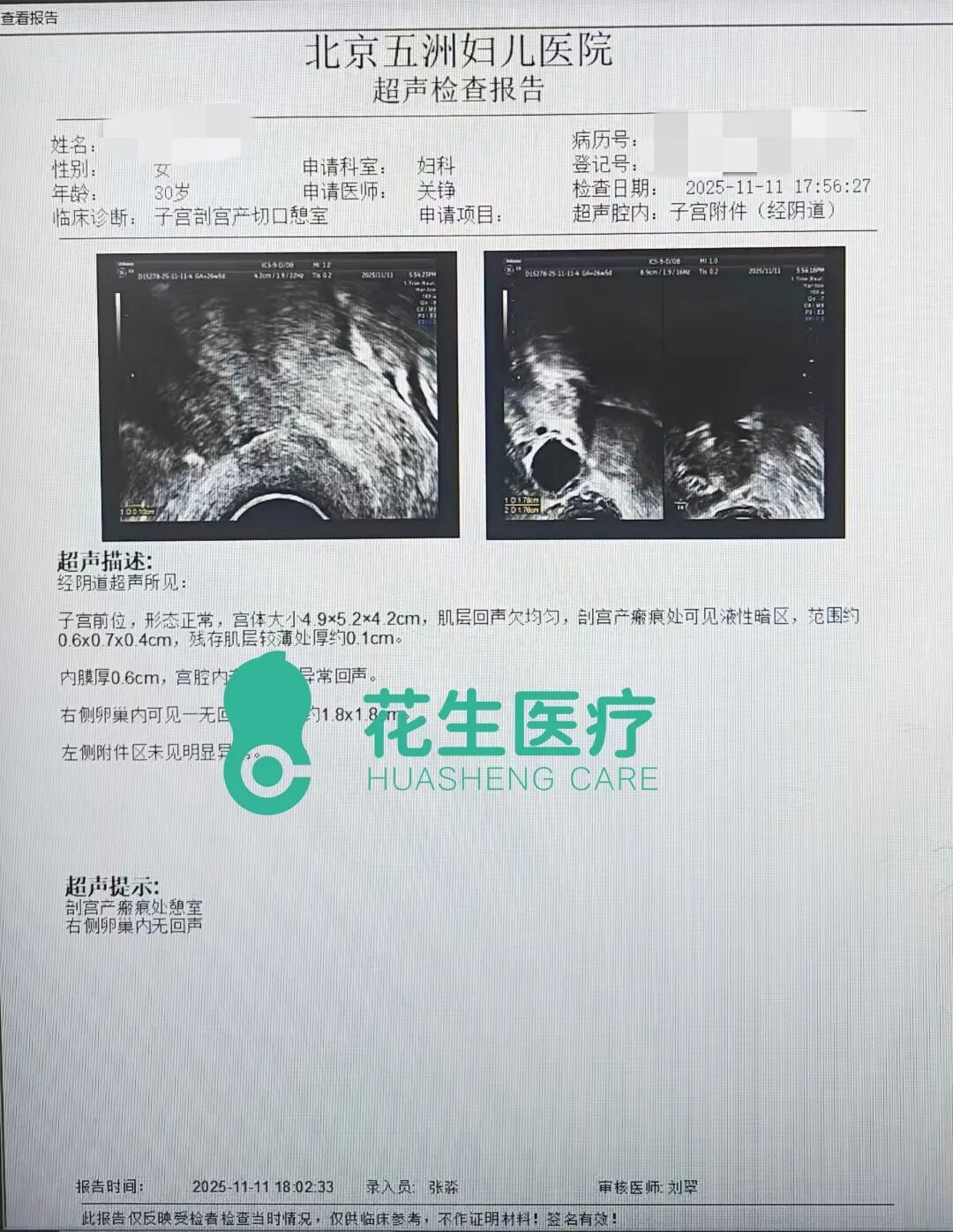 目前,花生五洲已将该技术纳入剖宫产后再生育管理标准流程,并联合多学科为患者提供术后备孕指导。曾因瘢痕憩室导致不孕的刘女士(化名)表示:“术后复查显示子宫肌层厚度恢复良好,现在正在备孕二胎。”