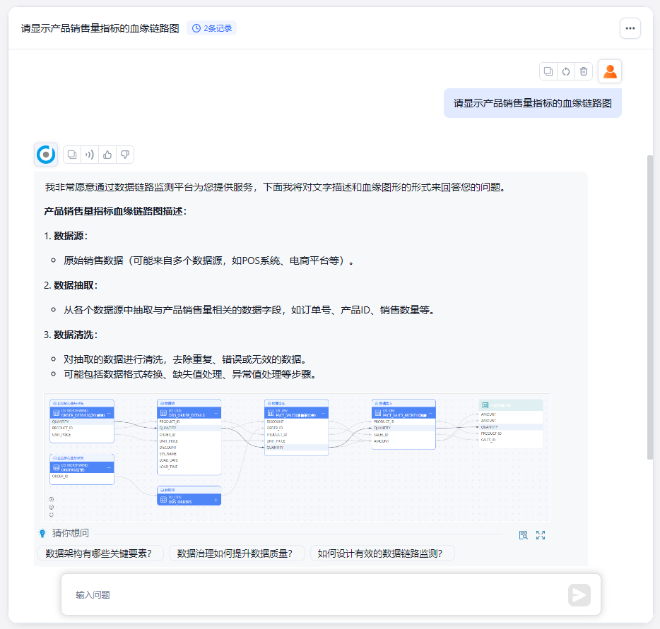 随着AI技术的发展,人们越来越习惯希望通过自然语言对话来寻求所关注的直接答案,基于血缘目录提出具体血缘问题,让它帮助我们快捷找到关注业务指标所对应的数据血缘关系结果,并以缩略图形式呈现出来确认是否进入探索分析模式。