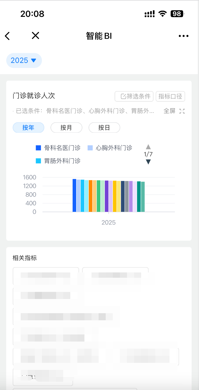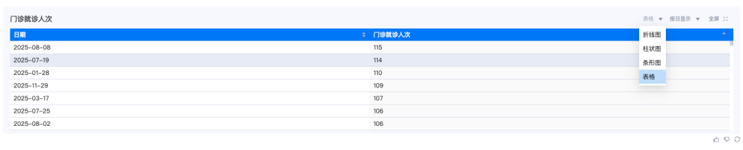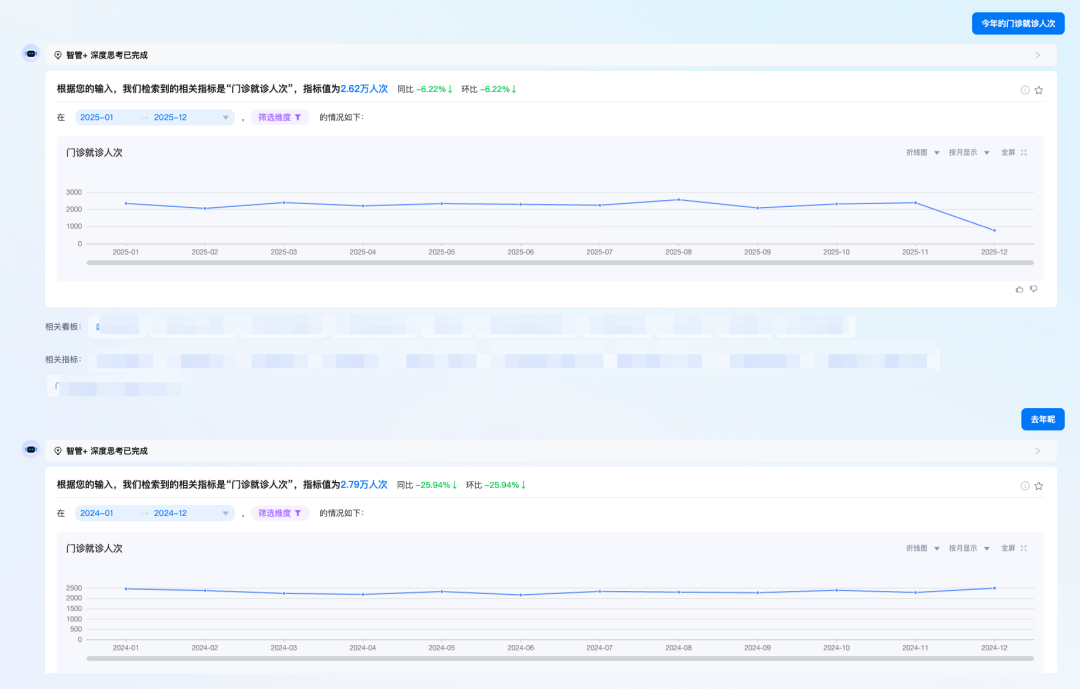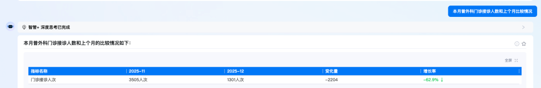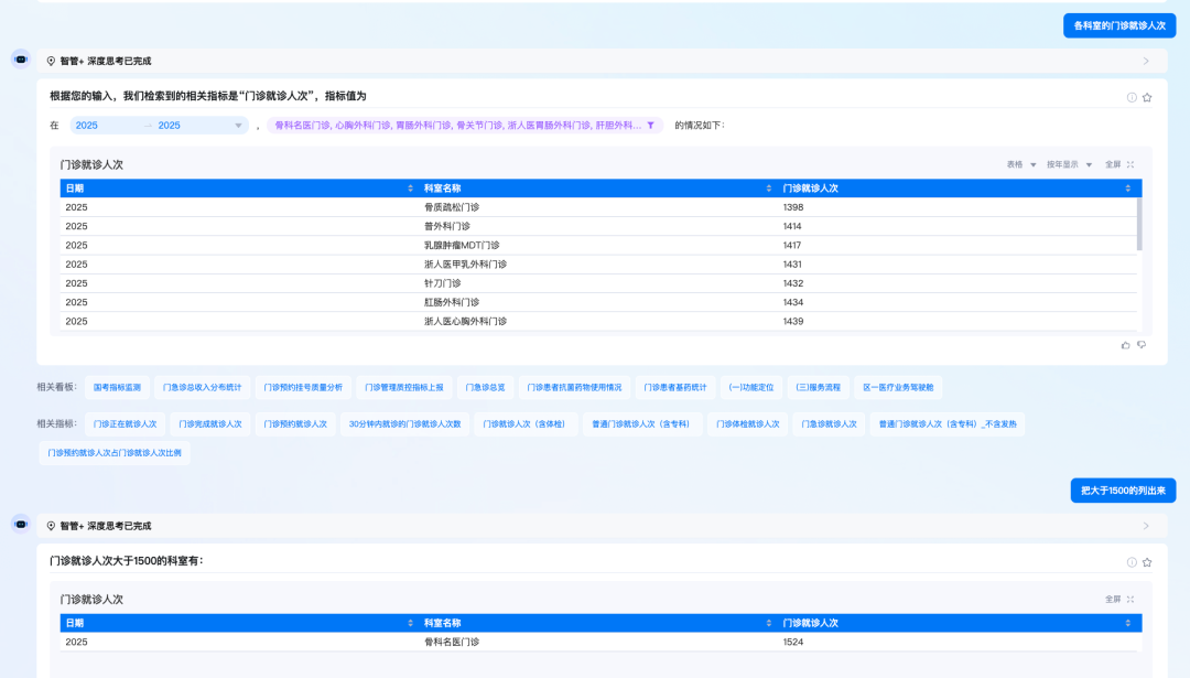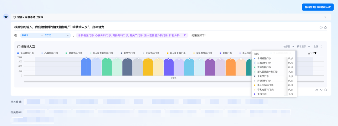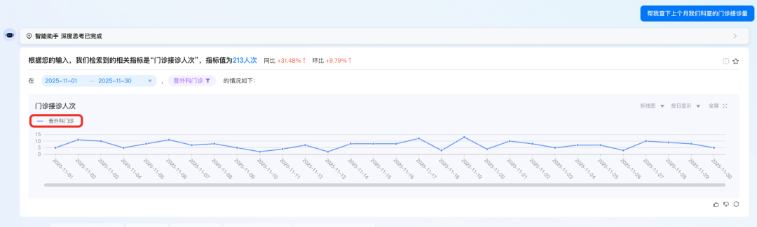 我们引入Chat2Metric的方式,直接面向指标库提问,一问即答用户想要查询的数据,用户不再需要学习复杂的SQL语法或拖拽式操作,只需在对话框中输入"上季度全院门诊量是多少?"或"最近哪个科室的就诊人数最多?"等问题,便能实时返回精准的分析结果和可视化图表。