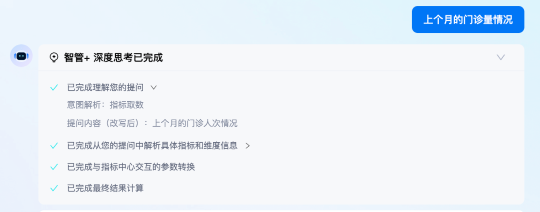 整条链路全程透明,每一步都留有可回溯的节点,既让用户一眼看懂数据是怎么来的,也确保了回答可追溯。系统会将复杂问题自动拆解为一系列可执行且透明的中间步骤,包括:意图理解、指标与维度的检索及结构化抽取、参数转换以及指标计算。整个执行过程完全开放,使得用户可以完整地获取并审视分析的思考链路,从而实现更深度的交互与信任。