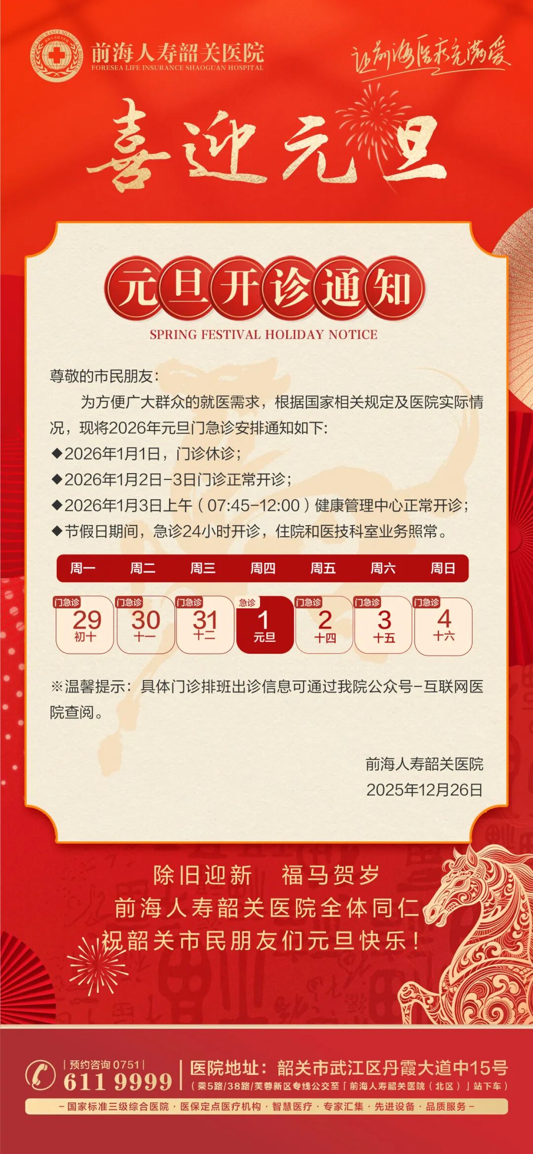 开诊通知 | 前海人寿韶关医院2026年元旦假期门急诊安排