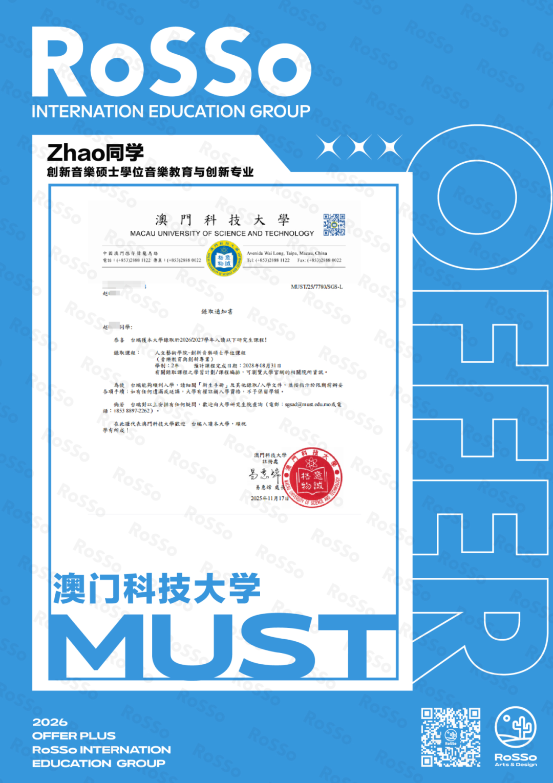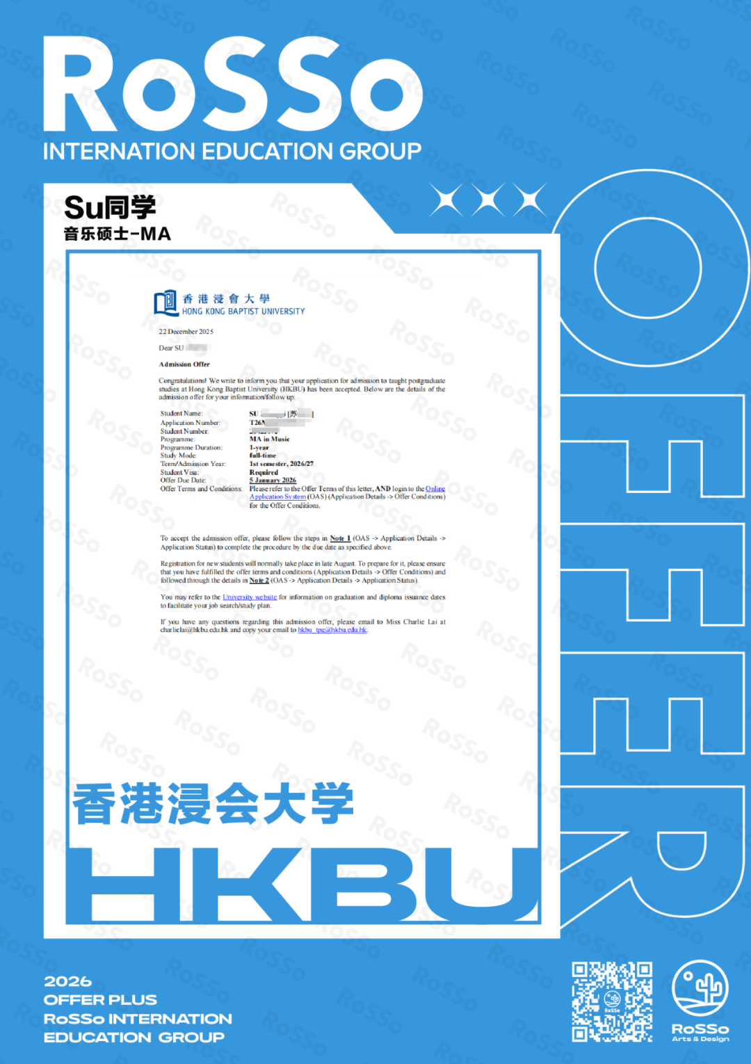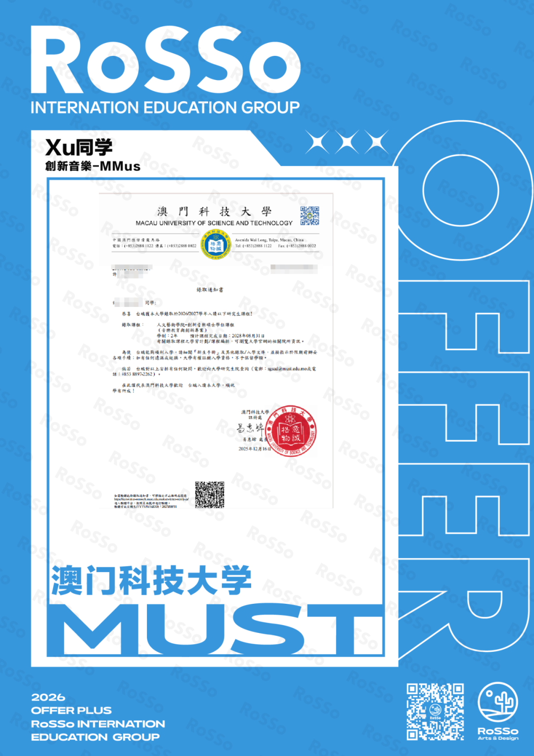 作为全球流行音乐教育的重镇,MI以实用型教学和行业资源著称,其录取门槛向来严苛,这枚Offer正是RoSSo学子专业能力与综合素养的有力证明。