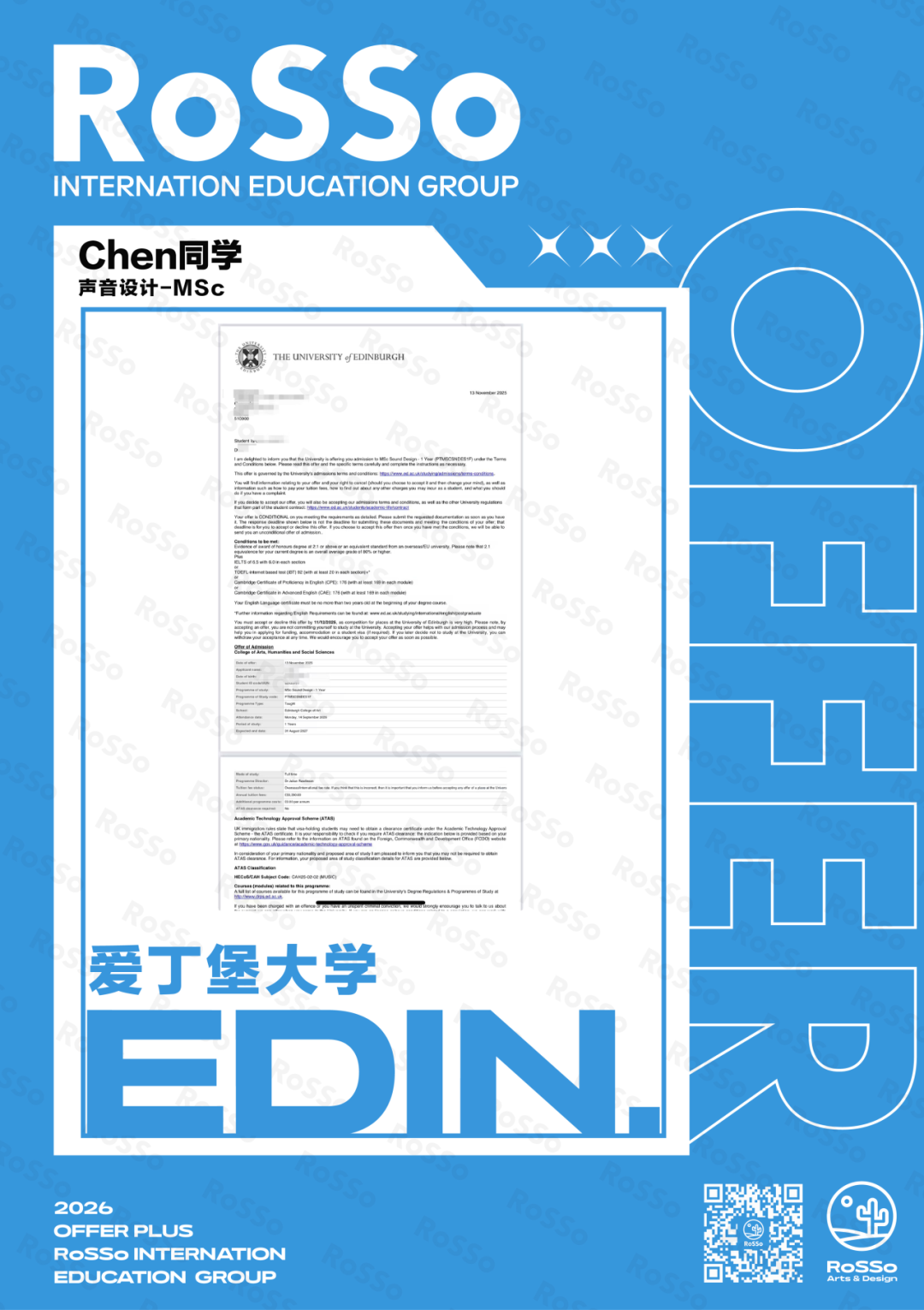 课程内容涵盖影视配乐、交互式音频、声音装置艺术等前沿领域,毕业生在电影、游戏、新媒体艺术等行业备受青睐。RoSSo Chen同学强势突围,成功拿下爱丁堡大学声音设计专业录取!