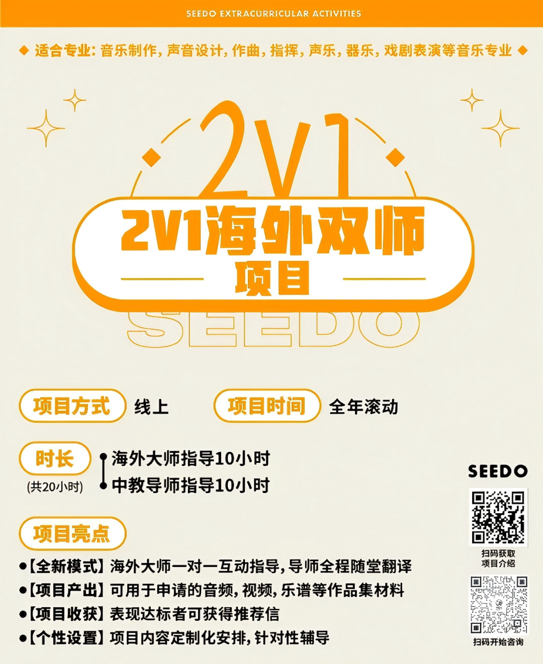 海外大师一对一互动指导,还有导师全程随堂翻译,帮你打磨可直接用于申请的音频、视频、乐谱等作品集材料,表现达标者更能收获海外大师推荐信,为你的申请履历狠狠加分!