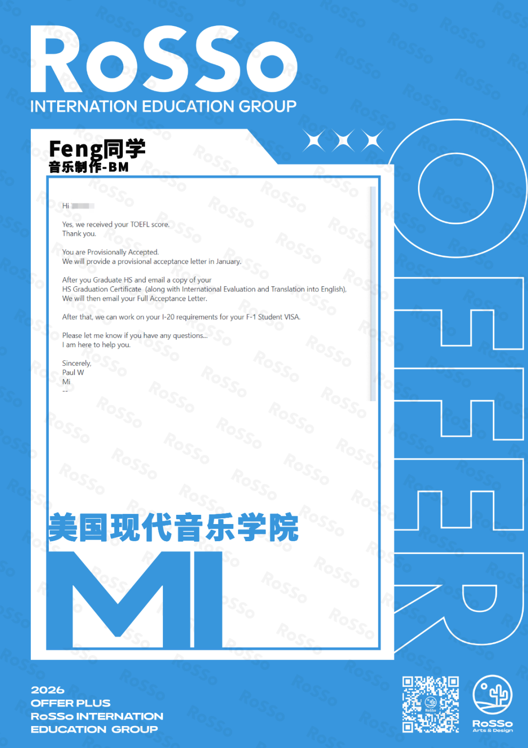 美国MI现代音乐学院同样传来捷报,RoSSo Feng同学实力斩获音乐制作专业本科Offer!