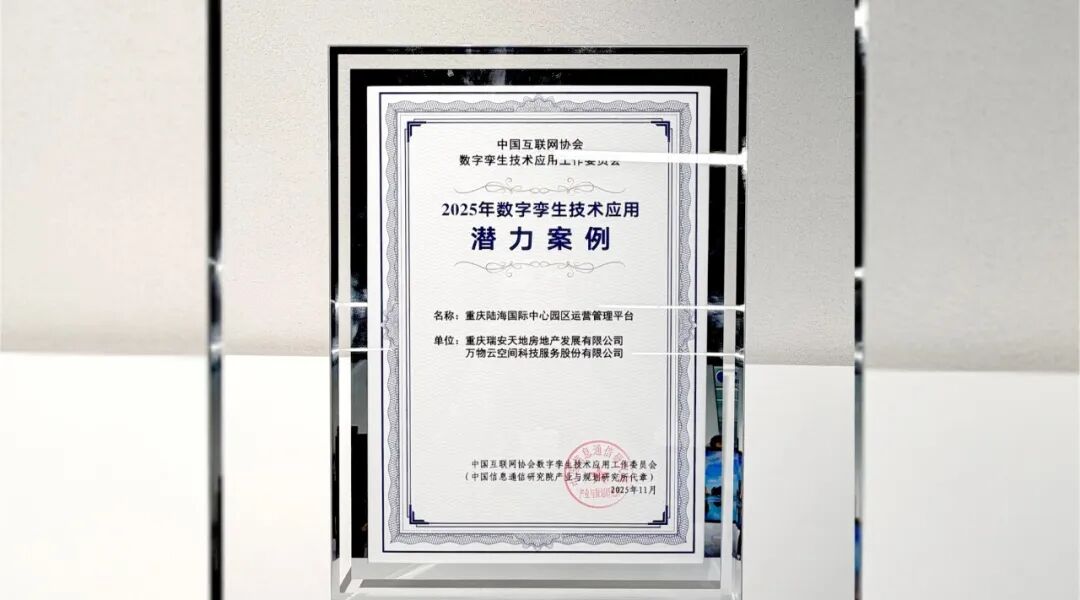 在重庆,万物云凭借“重庆陆海国际中心园区运营管理平台”项目,在第二届数字孪生技术与产业发展大会上荣获“数字孪生技术应用案例潜力案例奖”。