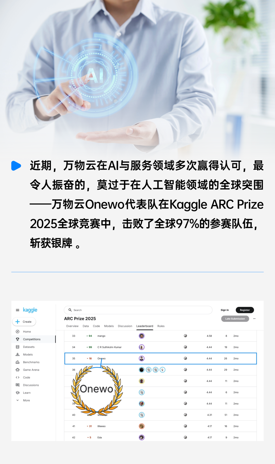 在刚刚结束的 Kaggle - ARC Prize 2025 全球人工智能竞赛中,万物云Onewo代表队在1455支全球顶尖参赛队伍中脱颖而出,斩获银牌,成绩位列全球前3%,在大模型研发方向取得技术突破。