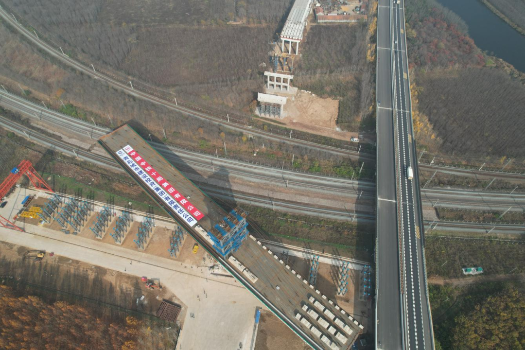 (图为全省最大不等跨T构钢箱梁涉铁转体桥成功转体)