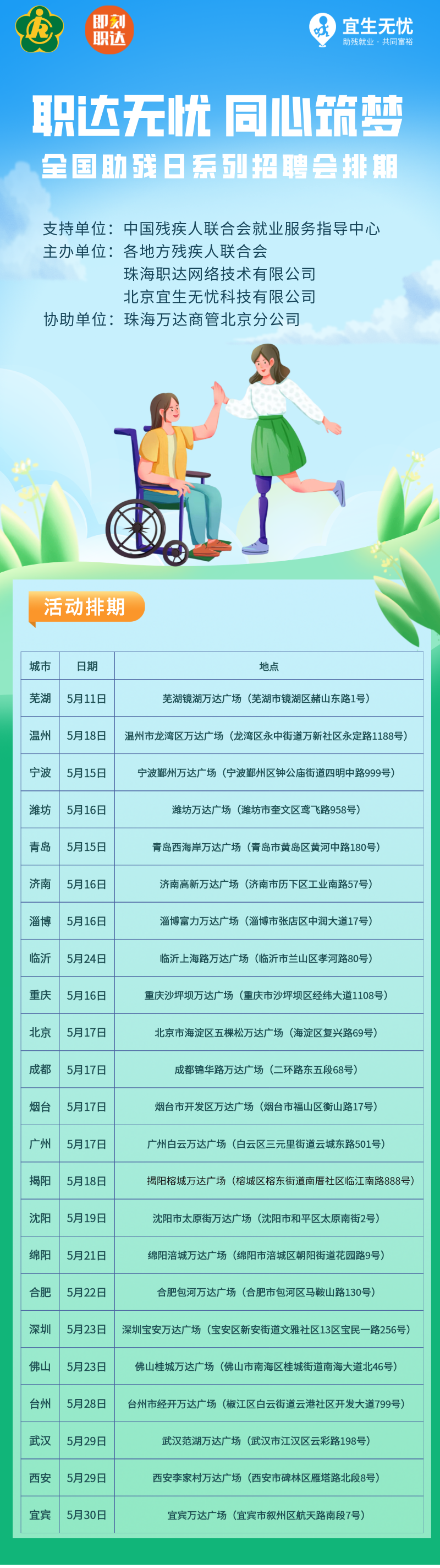 本次活动在中国残疾人联合会就业服务指导中心指导下开展,得到珠海万达商管上海分公司等单位的大力支持,旨在深入贯彻落实党的二十大关于“完善残疾人社会保障制度和关爱服务体系”的决策部署,积极推进《促进残疾人就业三年行动方案》,为残疾人群体搭建高效就业平台,助力其融入社会、实现自我价值。