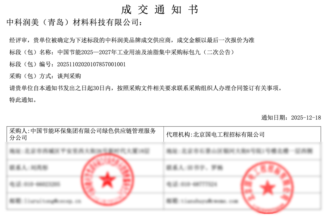 近日,中科润美成功中标中国节能2025-2027年工业用油及油脂集中采购。这是中科润美在能源领域应用的又一重大突破!