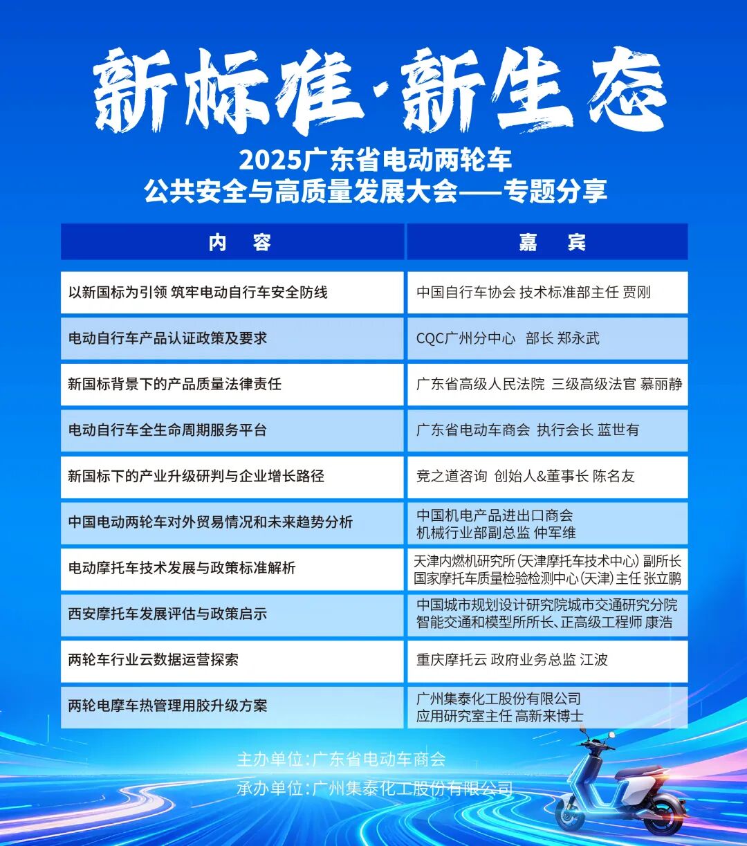为积极应对时代新阶段的要求,推动构建更高水平的产业生态,12月22日,由广东省电动车商会主办、集泰股份承办的2025广东省电动两轮车公共安全与高质量发展大会在广州举行。