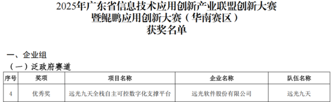 近日,2025年广东省信息技术应用创新产业联盟创新大赛暨鲲鹏应用创新大赛(华南赛区)在广州圆满落幕。远光软件自主研发的“远光九天全栈自主可控数字化支撑平台”,凭借显著的技术创新性与成熟的生态体系建设,在赛事中荣获泛政府赛道优秀奖。