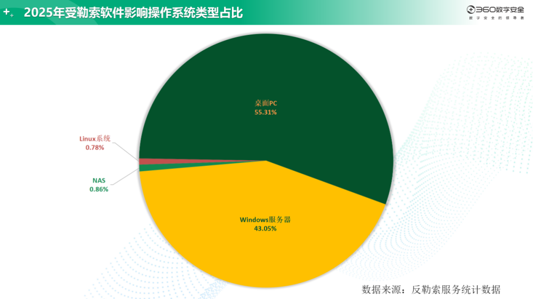 从操作系统类型的角度看,桌面PC整体占比亦随之下降至55.31%,而针对Linux及NAS系统的攻击则保持稳定但占比较低。这一变化反映出勒索攻击正持续转向服务器及政企目标,相关机构需进一步提升安全防护。