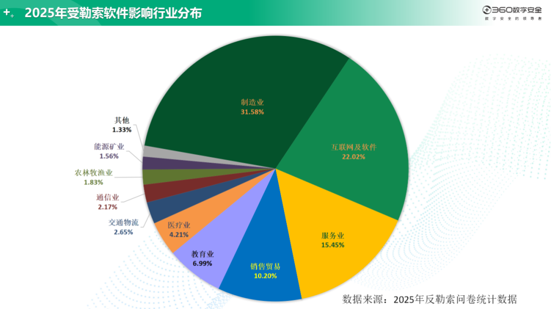 制造业、互联网及软件服务业以及服务业位列受害行业前三,医疗等敏感行业亦在其中。这些领域普遍具有信息化程度高、数据资产价值大、支付意愿强的特点,因此面临更大的暴露面和更高的勒索风险,成为攻击者持续聚焦的目标。