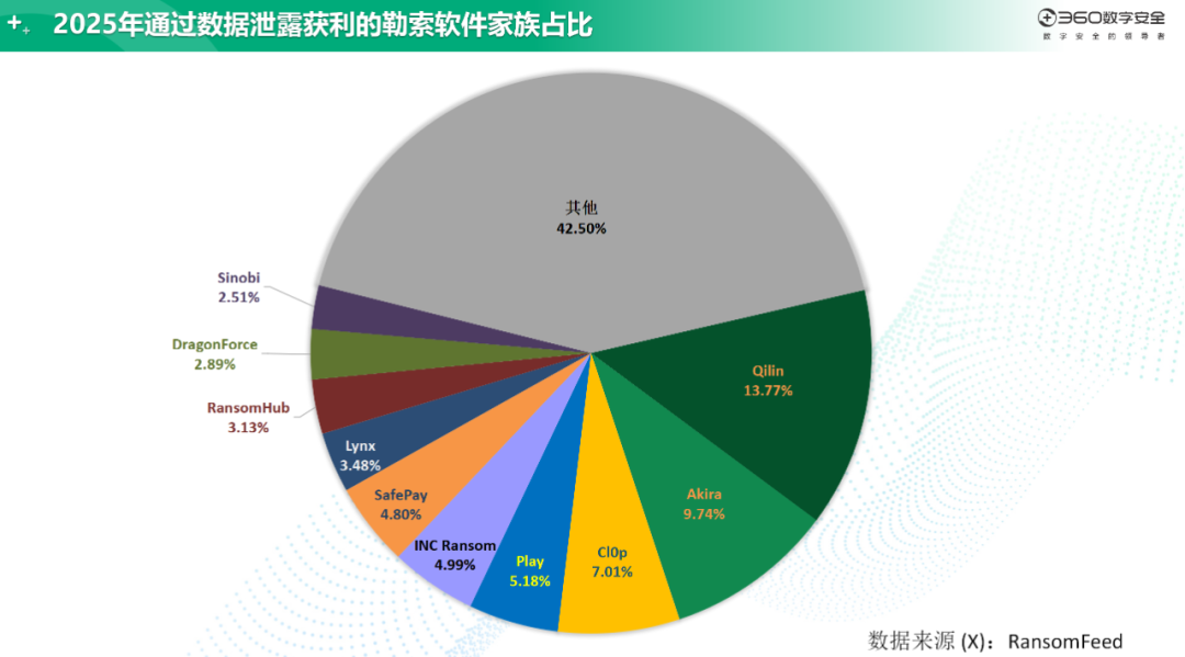 报告显示,2025年参与双重/多重勒索的活跃勒索软件家族达到122个,较2024年增长近三成。其中,头部Top10家族仍占据主导地位,但更多新兴家族占比显著提升,呈现出明显的长尾分布态势。