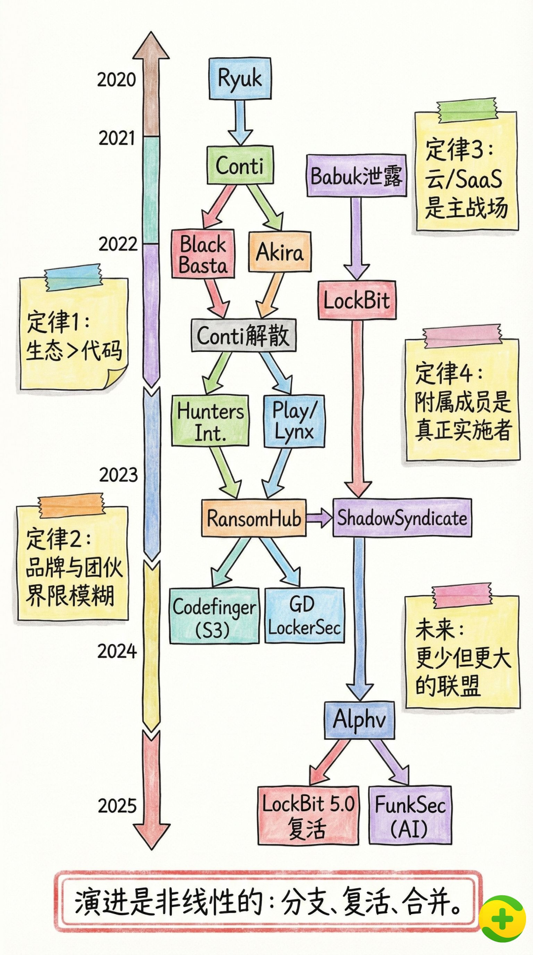 同时,报告总结指出,2025年勒索软件的演化呈现以下规律:生态协作而非代码本身成为家族维系的关键;品牌、团伙与开发者间的界限日益模糊;攻击主战场正向云环境、ESXi及SaaS服务转移。未来,勒索生态或将更多以“联盟”形式出现,而非独立的家族运作。