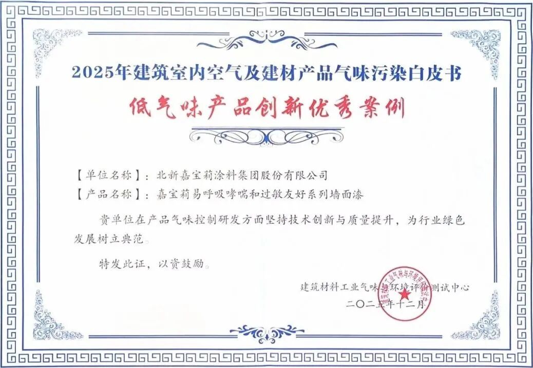 近日,《2025年建筑室内空气及建材产品气味污染白皮书》正式发布。在这份代表行业未来高质量发展方向的文件中,北新嘉宝莉旗下的易呼吸过敏友好抗菌耐污多效合一墙面漆,凭借其在“气味控制”方面的创新突破,作为优秀案例被收录其中。