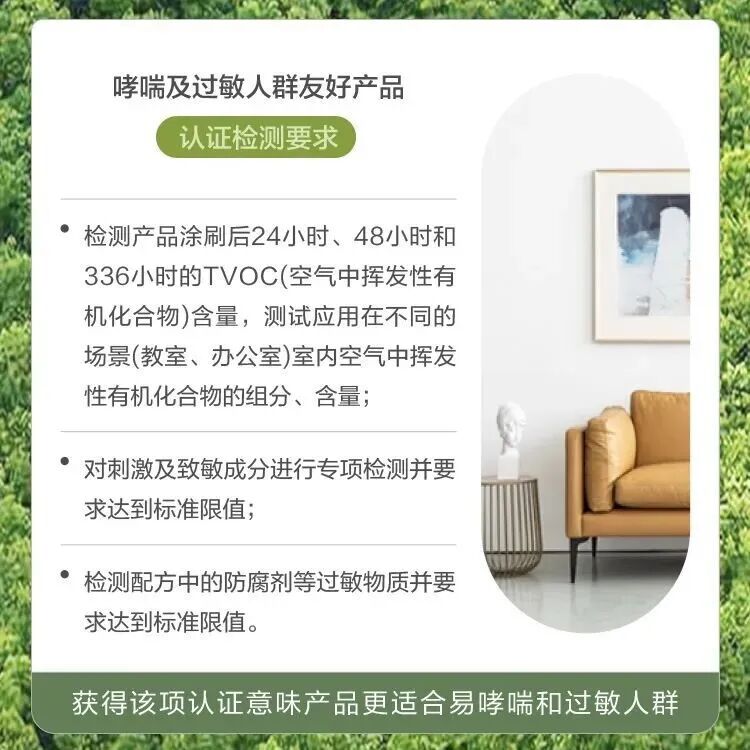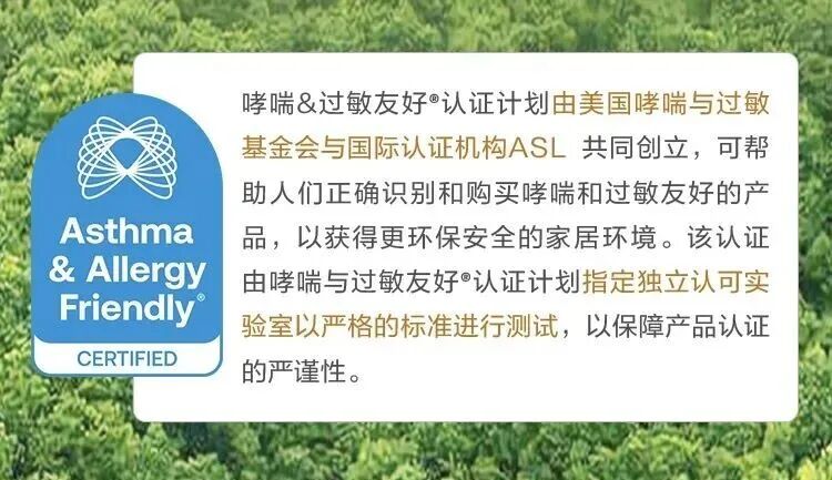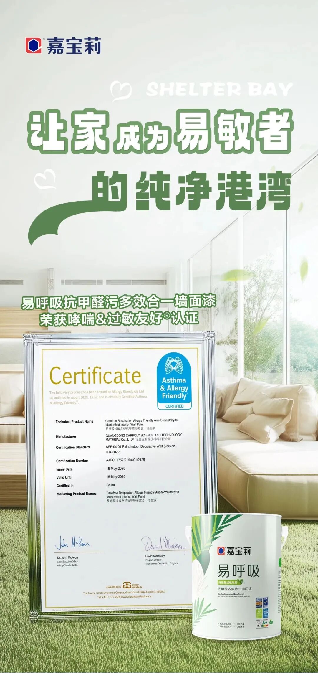 这84000多次选择,源于产品切实解决了很多家庭的核心痛点。易呼吸系列是中国涂料品牌中首款通过国际过敏标准有限公司(ASL)哮喘&过敏友好®认证的产品,其严选的抗过敏配方通过了六重国内外权威检测,专为易过敏及哮喘人群设计。