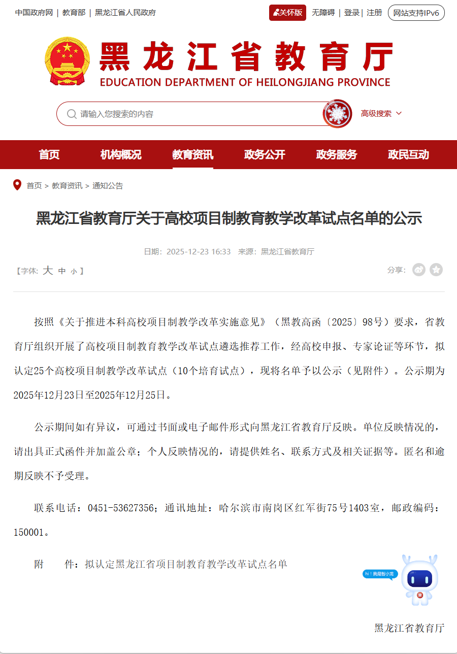 2025年12月23日黑龙省教育厅对高校项目制教育教学改革试点遴选推荐公示,拟认定25个高校项目制教学改革试点。哈尔滨广厦学院艺术与传媒学院《基于龙江冰雪文化创意设计产业项目驱动的艺术设计专业群人才培养改革》经专家论证认定为省级培育建设项目。该项目围绕龙江冰雪文化创意设计产业需求,构建冰雪文创特色育人体系、打造艺术设计新文科专业集群、创新产业项目与人才培养融合机制,持续提升服务区域特色产业发展质效。