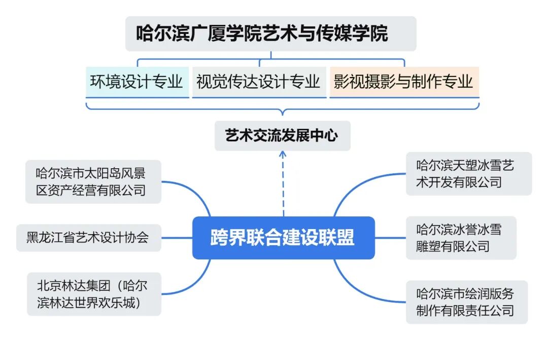 培育建设试点项目由哈尔滨广厦学院艺术与传媒学院艺术交流发展中心统筹,形成“中心统筹 + 多部门协同 + 校企联动”的三级组织架构,保障龙江冰雪文化创意设计产业项目与人才培养的深度融合。