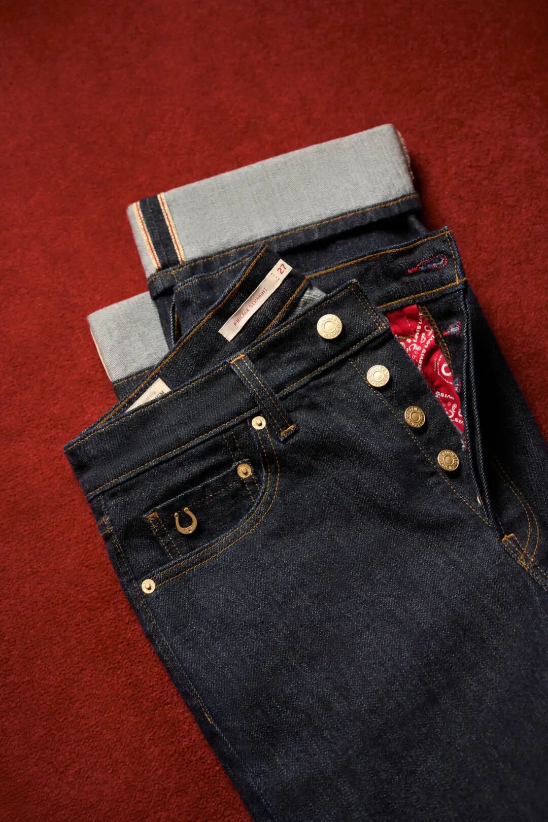 Levi's® 马年限定系列,巧妙地融合了中西美学。标志性的双马皮牌换成了节庆红调,和经典红旗标搭配超有新年氛围;夹克与牛仔裤上缀以金色马蹄铁装饰,寓意新年好运;金赤耳设计的回归,为细节增添低调光泽;内衬处修饰的腰果花纹,则延续 Levi's® 美式复古基因,在传统与新意之间游走自如。