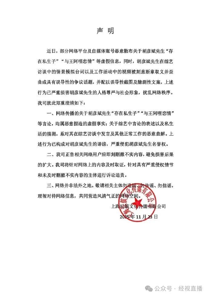 网络传播的关于胡彦斌先生“存在私生子”“与王阿哩恋情”等言论,均属恶意捏造的虚假事实;