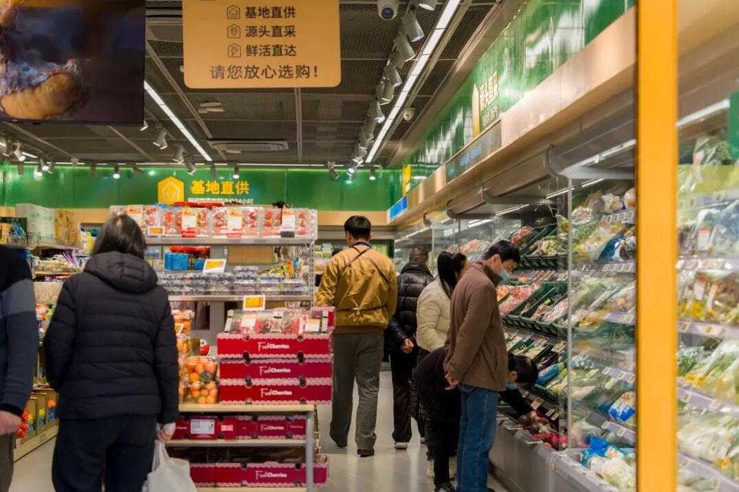 “不贵哎,也蛮新鲜的”,两位奶奶站在南京江宁胜太路店内的蔬菜区前比较着价格,她们一边挑选着当天的青菜,一边交流着哪家的鸡蛋更实惠。这是社区小店独有的场景——它不仅是交易场所,更是信息交换站、邻里社交点。前一天试营业时已经买过米和油的年轻夫妻俩今天又来了:“昨天买的米煮饭很香,今天再来买点菜籽油”,她的购物袋里已经装了一些新鲜的水果蔬菜。