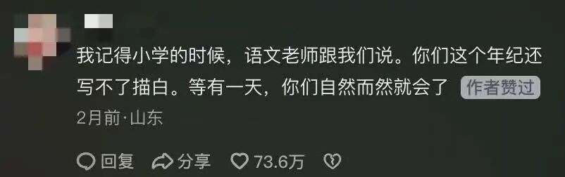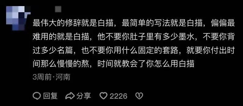 还有人说:“我记得小学语文老师讲过,你们这个年纪写不了白描。等有一天,你们自然而然就会了。”